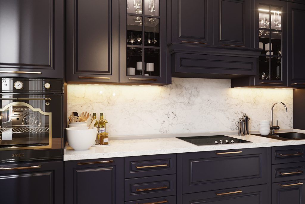 Немаловажную роль в создании максимального комфорта играет и материал столешницы для стильной кухни. В Европе давно отказались от применения ламинированных ДСП в пользу каменных столешниц, способных послужить еще и внукам.