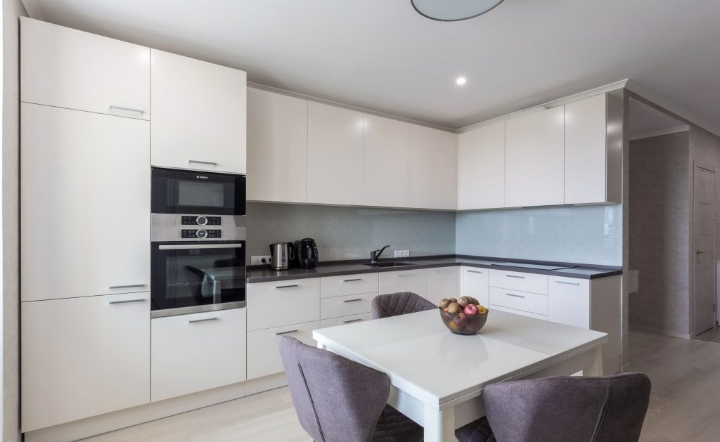 Линейные формы кухонь, как правило, выбирают люди ценящие простоту и лаконичность, а также владельцы достаточно узких помещений, которые не подойдут для угловых форм. В этом случае вся гарнитура размещается вдоль одной стенки, благодаря чему появляется свободное пространство для расположения обеденного столика.