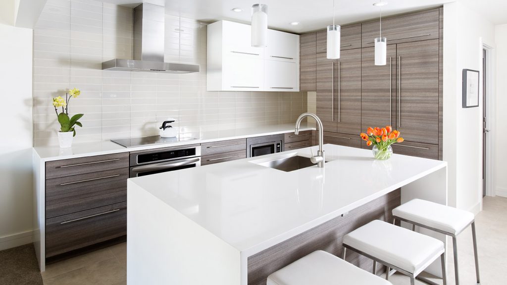 Тренд кухни 2020 — цельные столешницы, они практически лишены слабых мест, свойственных обычным каменным столешницам, — возможности просачивания воды в щели между столом и мойкой, сколов по краям.