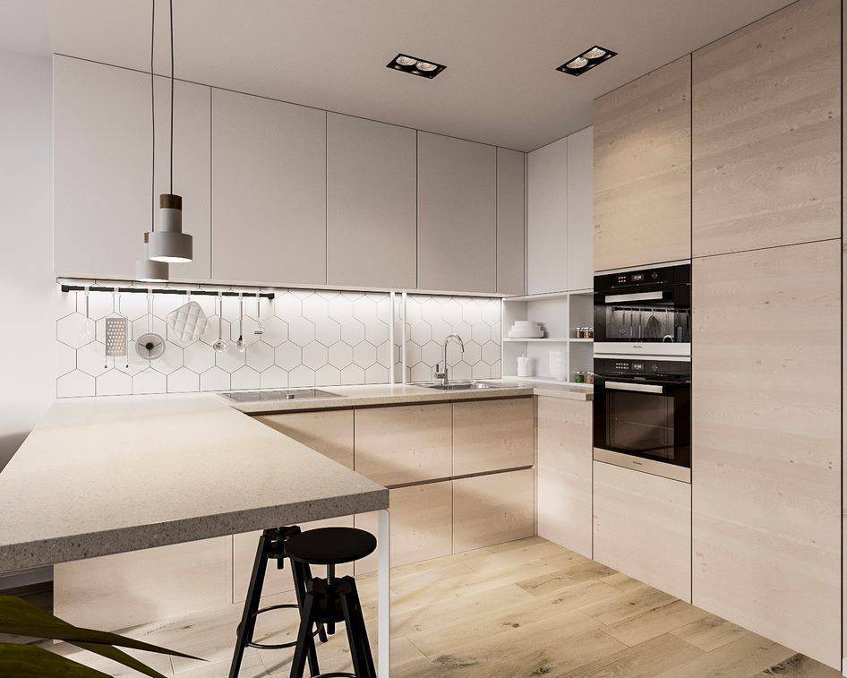 Оформление поверхностей разными материалами позволит избежать монотонности. В этом проекте для столешниц рабочей поверхности использован камень разных оттенков, а фартук выполнен из стали. Проект квартиры в стиле минимализм, ЖК «Река», дизайнер Павел Герасимов