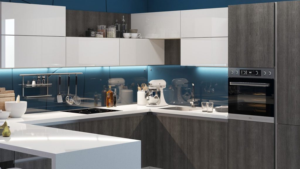 Особое внимание уделяется фартуку – промежутку стены над рабочей зоной. Для его отделки можно применить керамическую плитку, мозаику, закаленное тонированное стекло или же искусственный камень