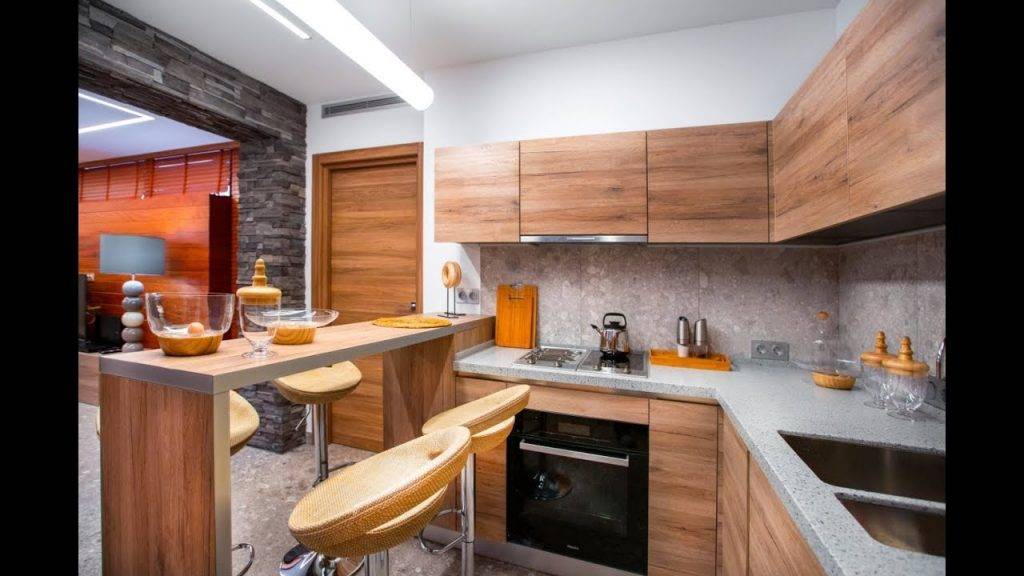 Стандартный стол для маленькой кухни можно заменить на барную стойку. Конструкцию не обязательно делать громоздкой. При расчёте размеров обязательно учитывают численность проживающих. Вариант возможен как в обособленной комнате, так и в кухне-гостиной или при объединении площади с балконом.