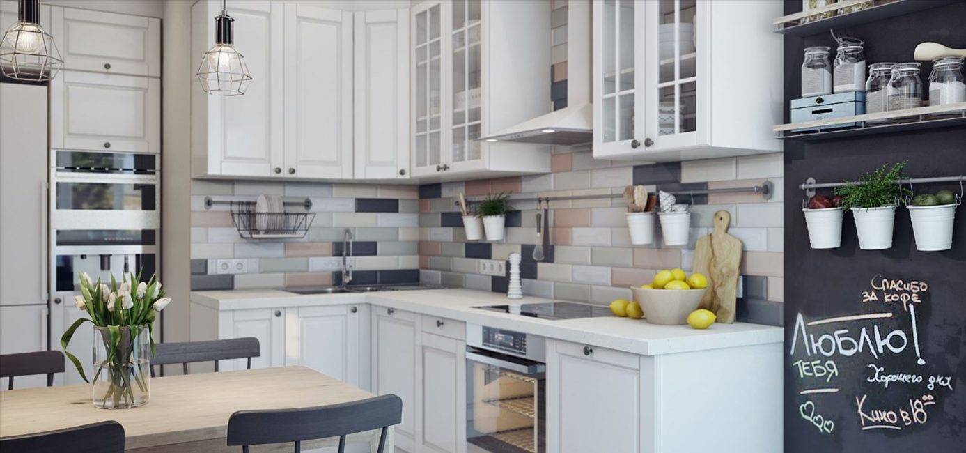 Большое значение в кухне имеет фартук, монтируемый между столешницей гарнитура и навесными шкафами. Этот элемент отделки позволяет защитить стену от различных брызг во время приготовления пищи и мытья посуды. Фартук может создаваться из плитки, пластиковых или ламинированных панелей, а также стекла, декорированного различными изображениями, имитацией натуральной выбеленной древесины или кирпичной кладки. Фартук иногда может делаться контрастным по отношению к стенам и являться ярким акцентом интерьера.