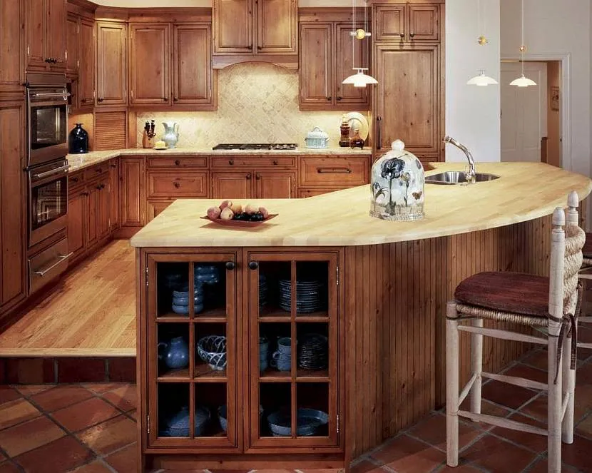 В цвете дуба, сосны и ели можно оформить фасады гарнитура, столешницу, паркетный пол, дверное полотно, оконные рамы или даже балки на потолке.