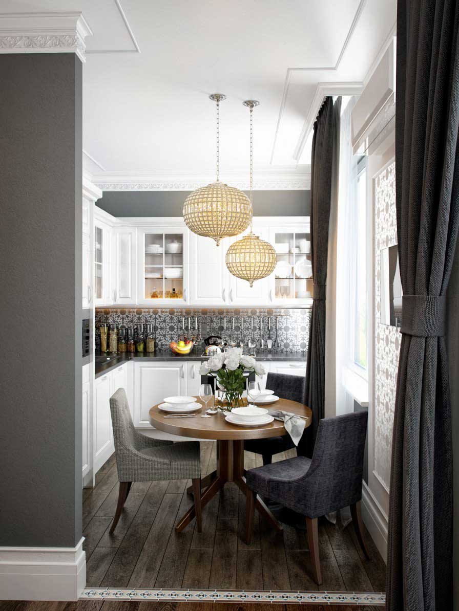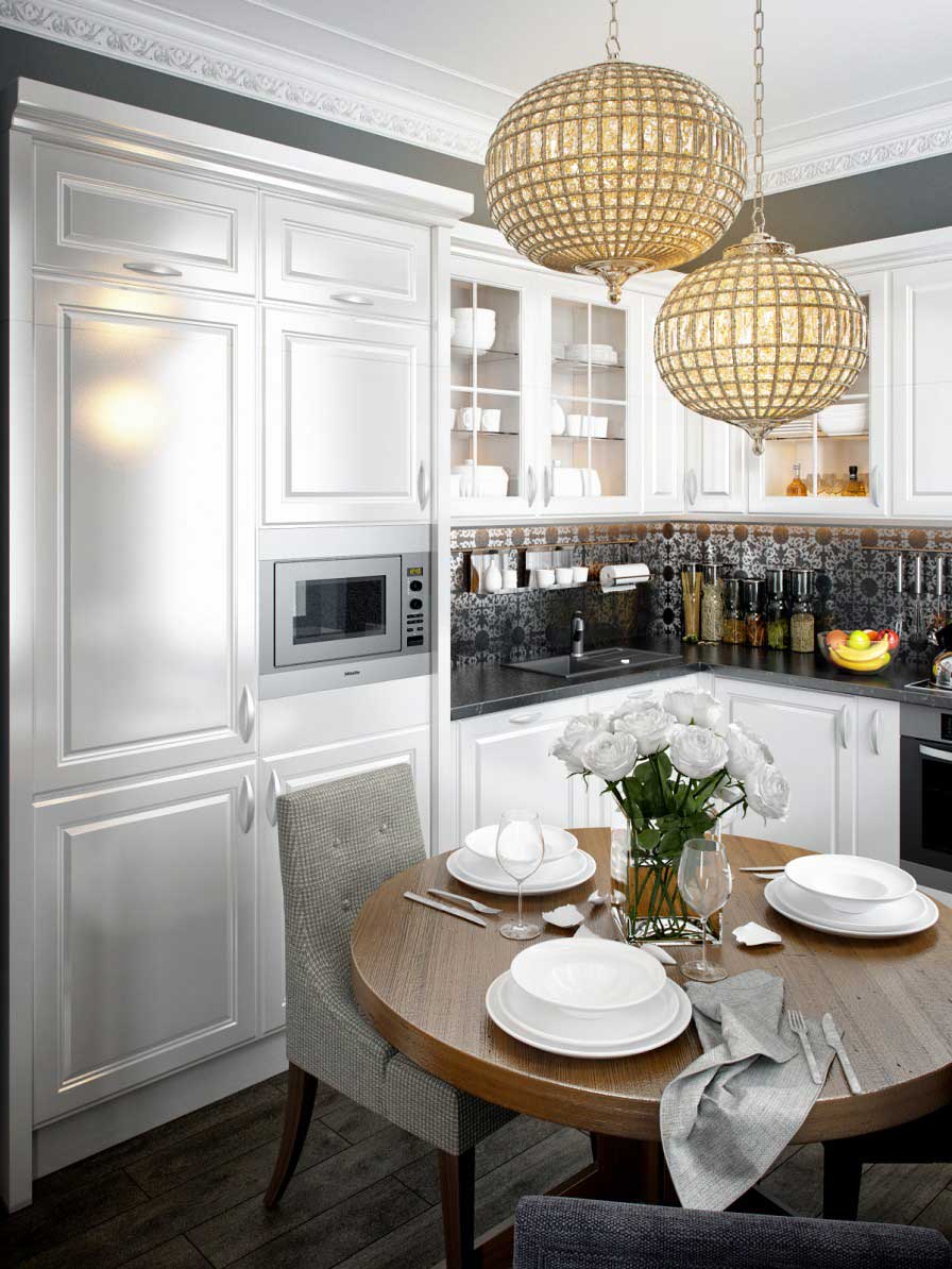 Изысканная классика сочетается с элементами востока и включает в себя современные отделочные материалы и встроенную современную технику. В интерьере этой современной кухни 6 кв. м. сочетаются оттенки белого и серого цветов с добавлением деревянных деталей и чёрных элементов.