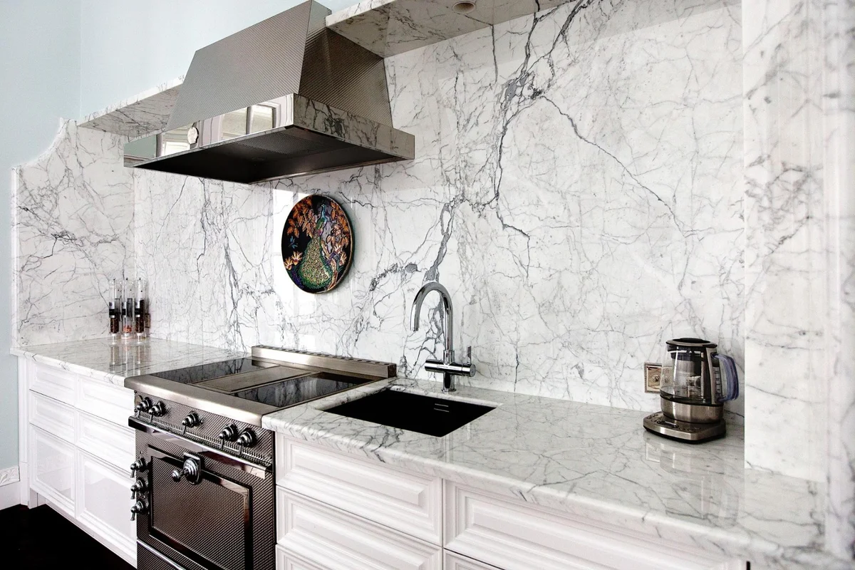 Мрамор подходит для сочетания с другими видами камней, полированных поверхностей, металлов и дерева. Достаточно легко перенести его в имеющуюся кухню — можно изменить рабочую поверхность, выбрать мраморную раковину или выложить остров этим роскошным камнем.
