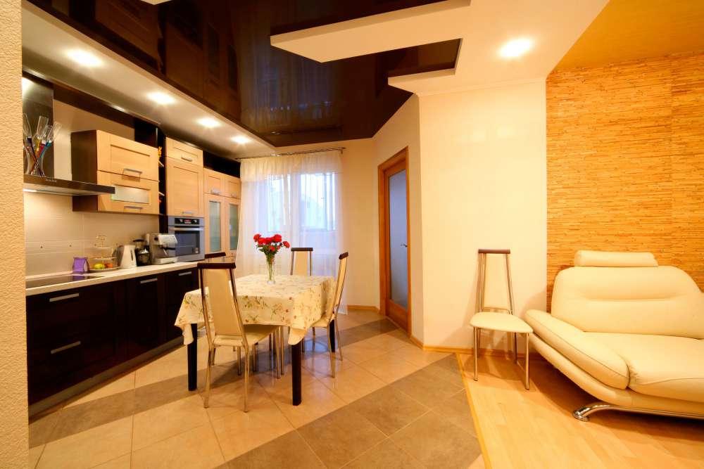 Комбинируемое с глянцевыми потолками освещение может быть центральным, рассеянным, точечным или контурным. Но согласитесь, небольшое пространство имеет некоторые ограничения в плане светильников – например, от огромной люстры посреди кухни определенно придется отказаться.
