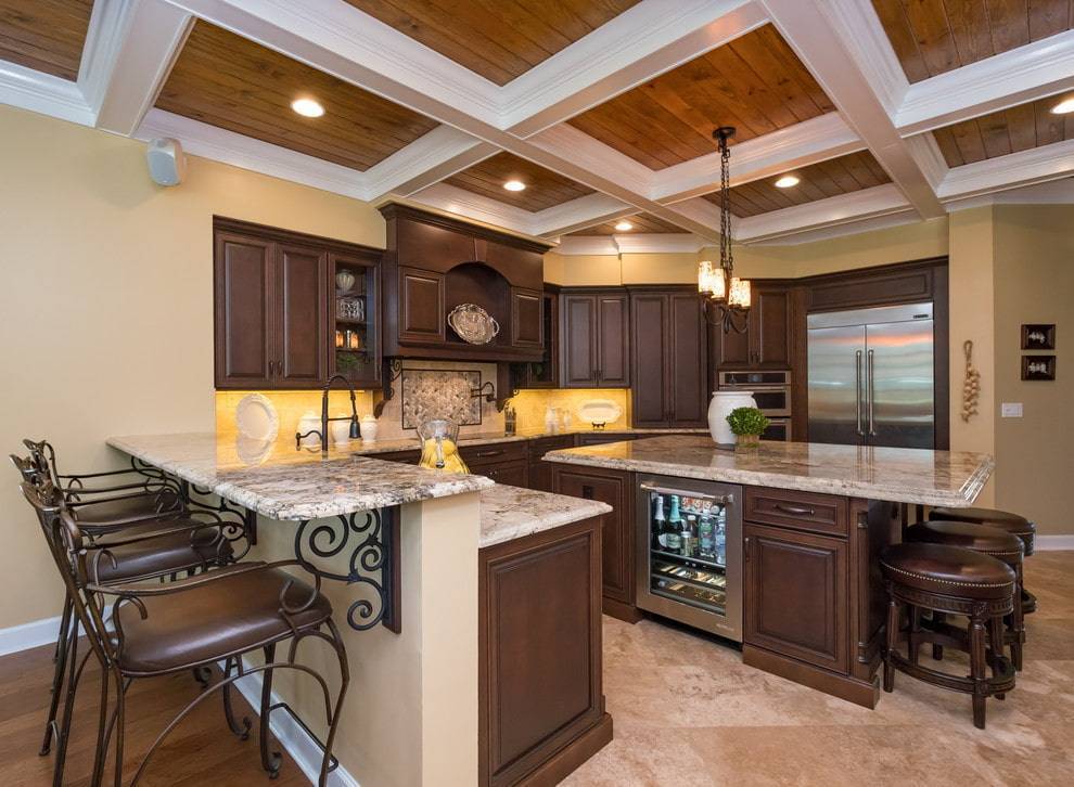 На фото интерьер классической кухни с потолком, декорированным лепным орнаментом.