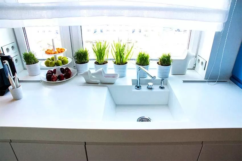 - Широкая столешница. Мойка – продолжение кухонного гарнитура, к которому добавляются лишние сантиметры за счет подоконника. Теперь эта зона будет широкой и комфортной.
