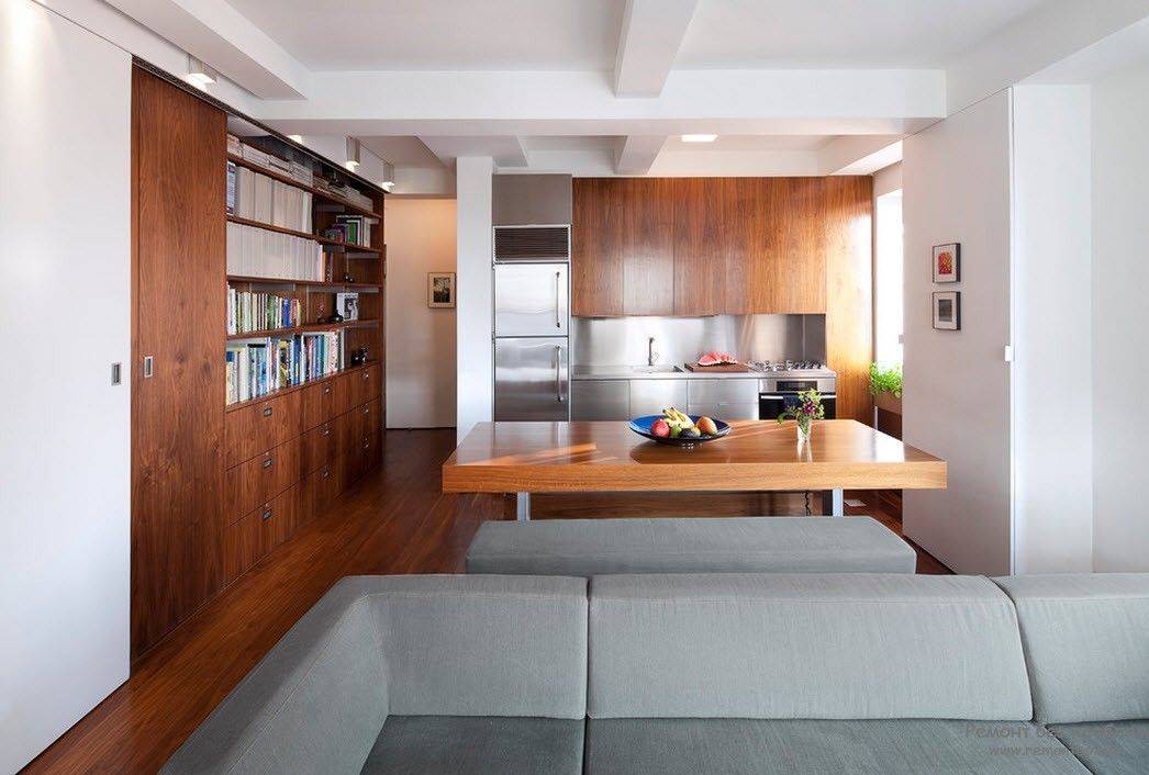 Когда мы сносим стену полностью, то высвобождаем максимум пространства. Однако и вся кухонная зона будет на виду. Данный способ хорош тем, что можно заложить бывший вход в кухню. С тем, чтобы в получившуюся нишу поставить предмет мебели или холодильник. Делая широкий межкомнатный проход, вы хотя бы зрительно сохраняете границы между комнатами. А значит, и сохраняете возможность уединиться в одном из двух помещений. При этом вы реально объединяете комнаты и получаете лишние квадратные метры для реализации своих интерьерных задумок.