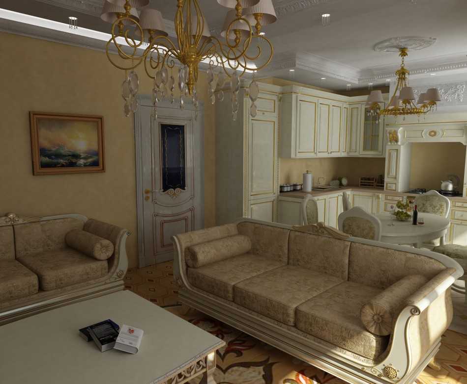 Классика всегда в моде, как и ампир. Кухня-гостиная в загородном доме, оформленная в таком стиле, будет смотреться вполне гармонично