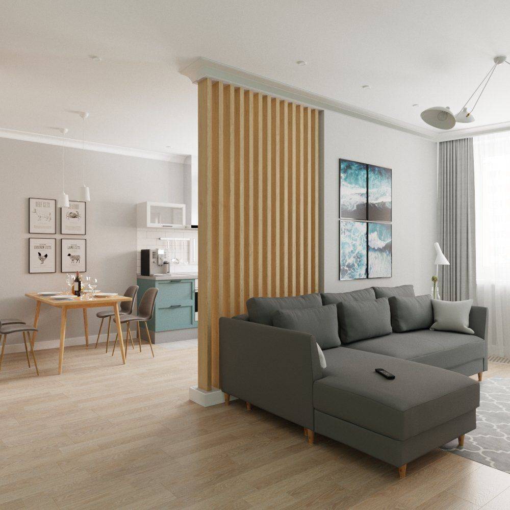 - Отгородиться от кухни можно будет небольшой фальш стеной с установленным телевизором. При той же площади из «гостиной» пространство будет казаться больше за счет частично просматривающейся кухни в глубине дома.