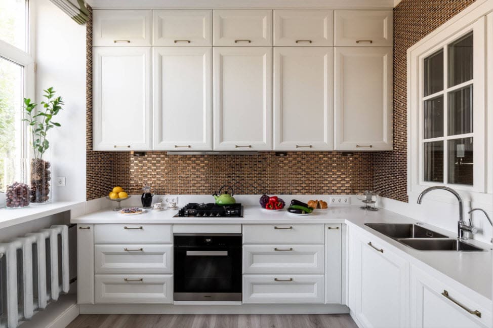 - Фартук обычно заходит под навесные ящики, без них придётся как-то оформлять торцы плитки.