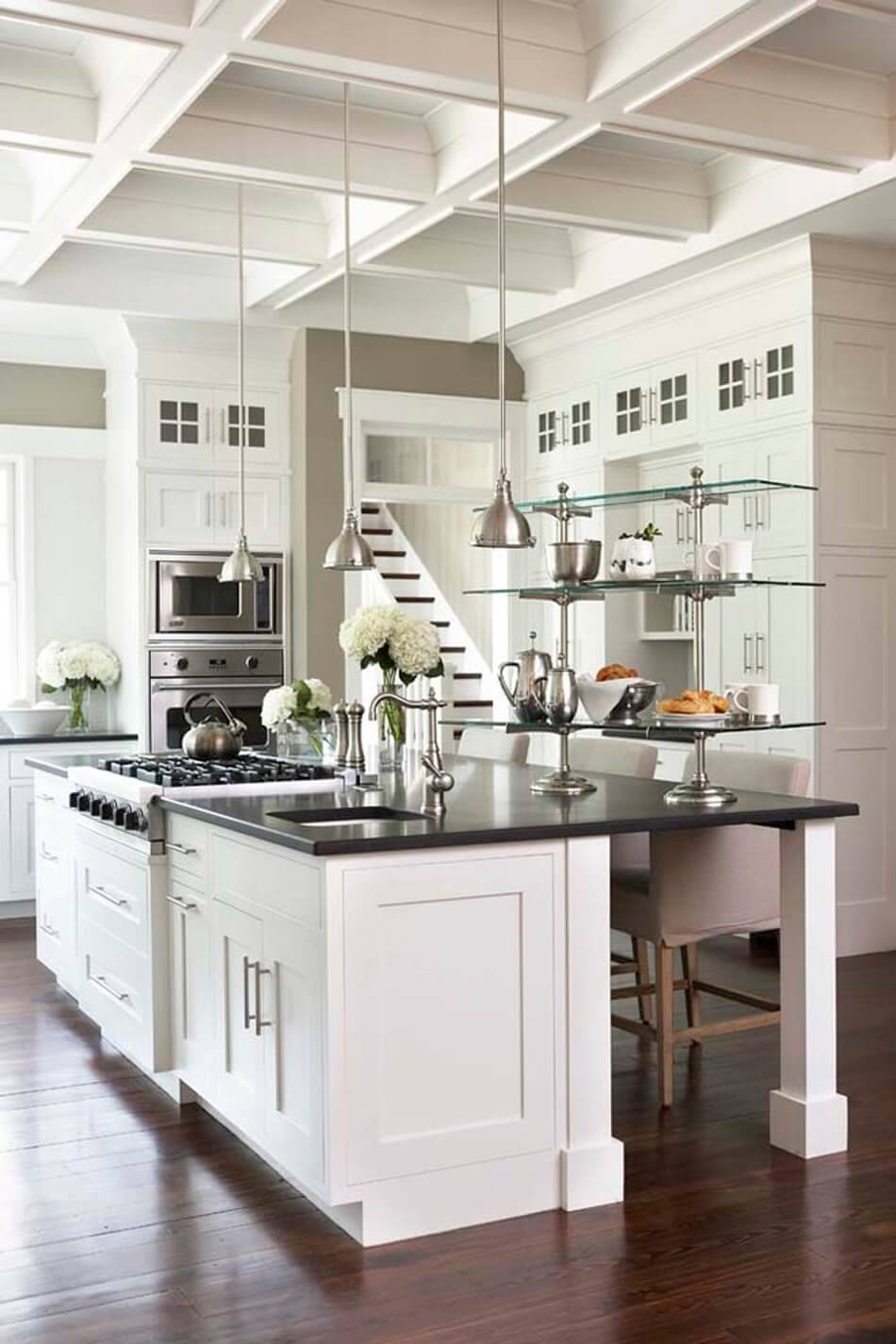 Если хочется выдержать кухню одновременно в классической и современной манере, совместить элегантность, роскошь с функциональностью минимализма, то получится помещение в неоклассическом стиле. Характерными архитектурными приемами будут арки, колонны, эркеры, лепные розетки, всевозможные настенные декоративные детали. В частном доме современная классика подчеркивается дорогими отделочными материалами, использованием потолочных балок, декоративной штукатурки, мебели из массива дерева. Изящества придадут резные элементы, зеркала, картины с тяжелыми деревянными рамами.