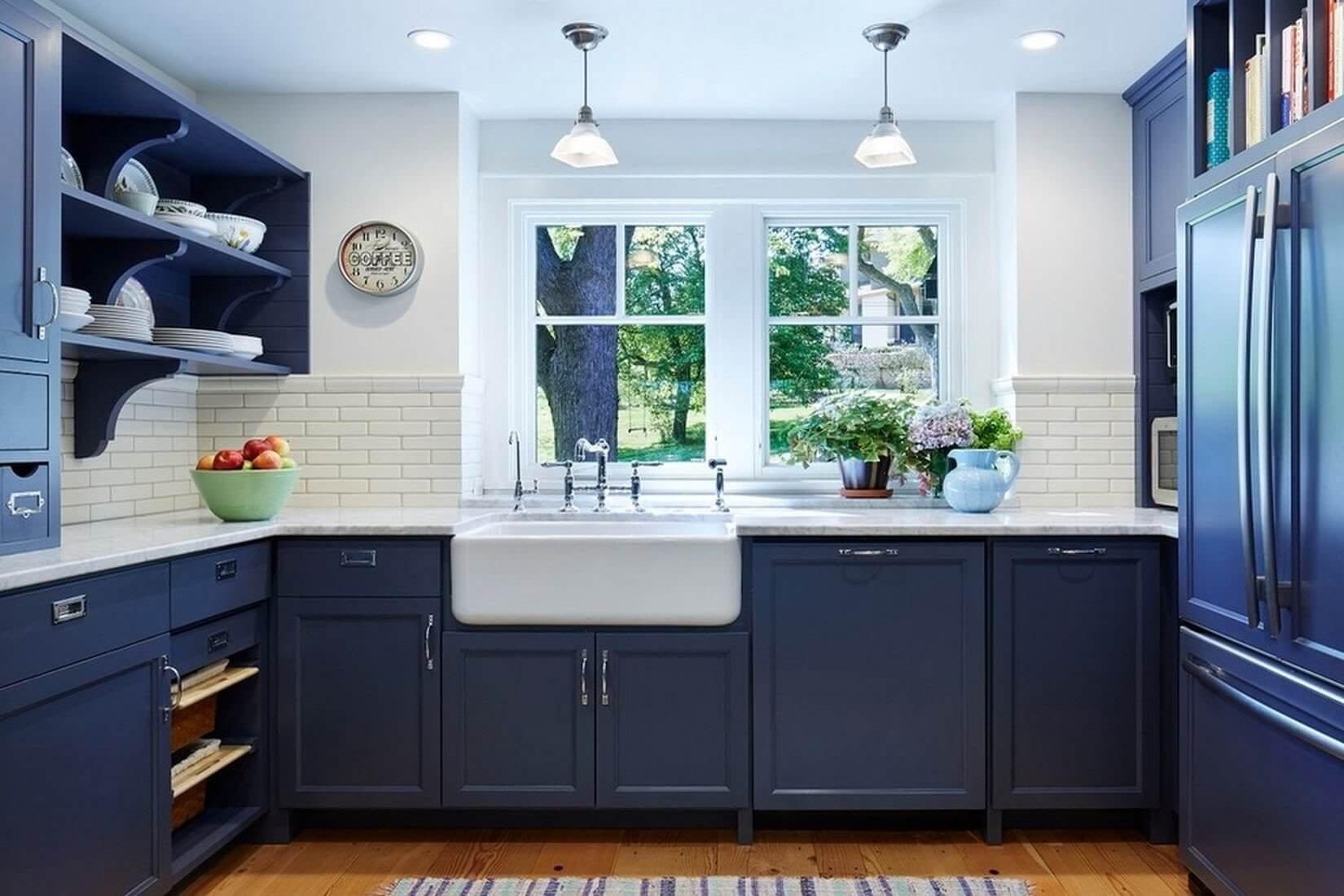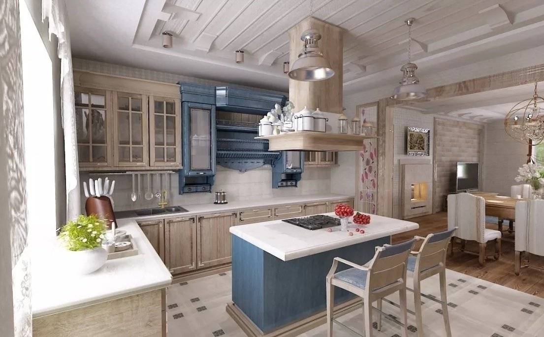 Цветовые решения для просторного помещения могут быть абсолютно любыми: здесь будут уместны как светлые оттенки стен и обстановки, так и более интенсивные. Например, при желании обустроить кухню в стиле сельский прованс уместным будет насыщенно-синий кухонный гарнитур или темные деревянные полы.