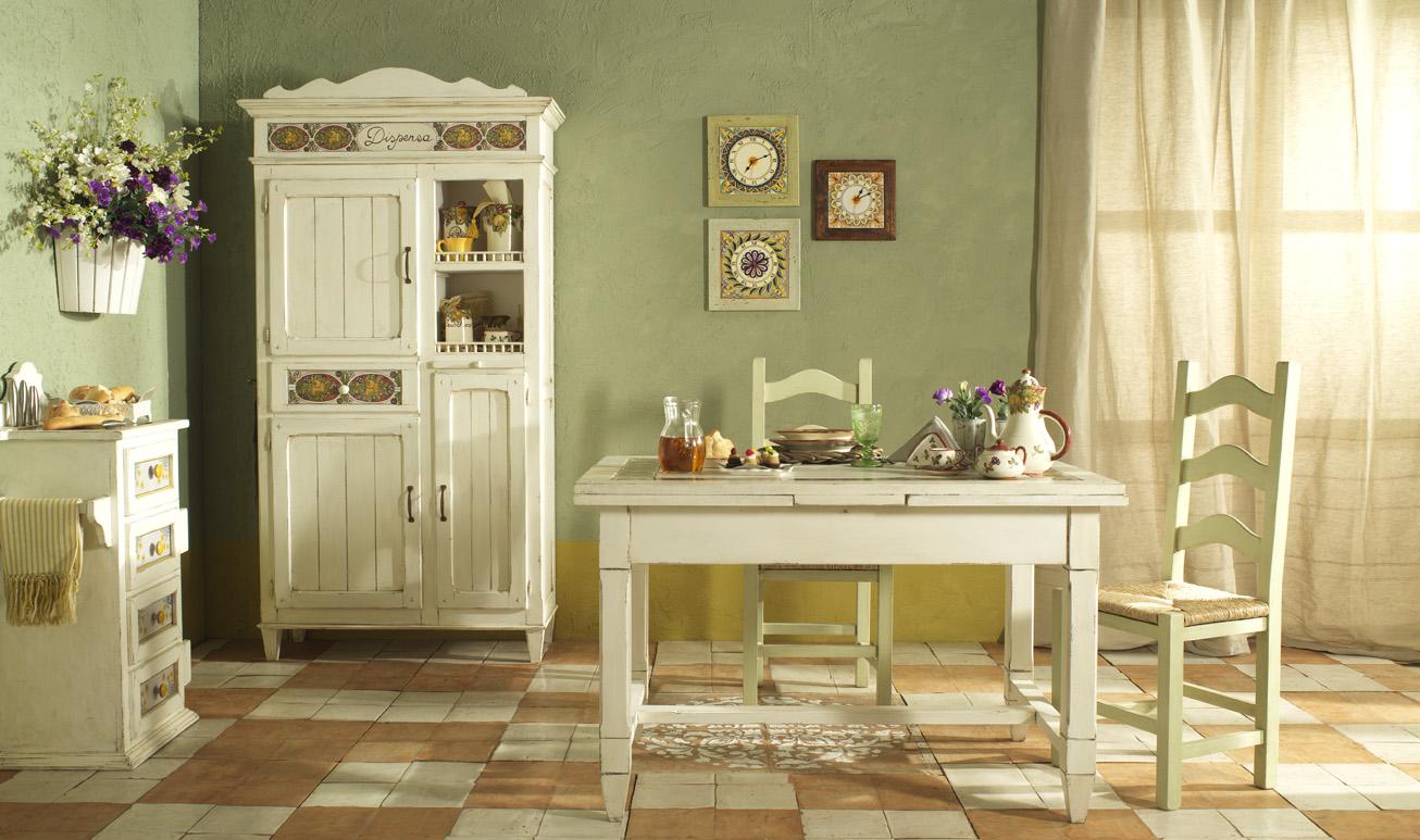 Мебель прочная, возможно, выполненная вручную. Приземистый буфет из сосны или дуба, итальянский стиль прованс допускает соседство кованых элементов в виде каркасов, изразцов, перил.