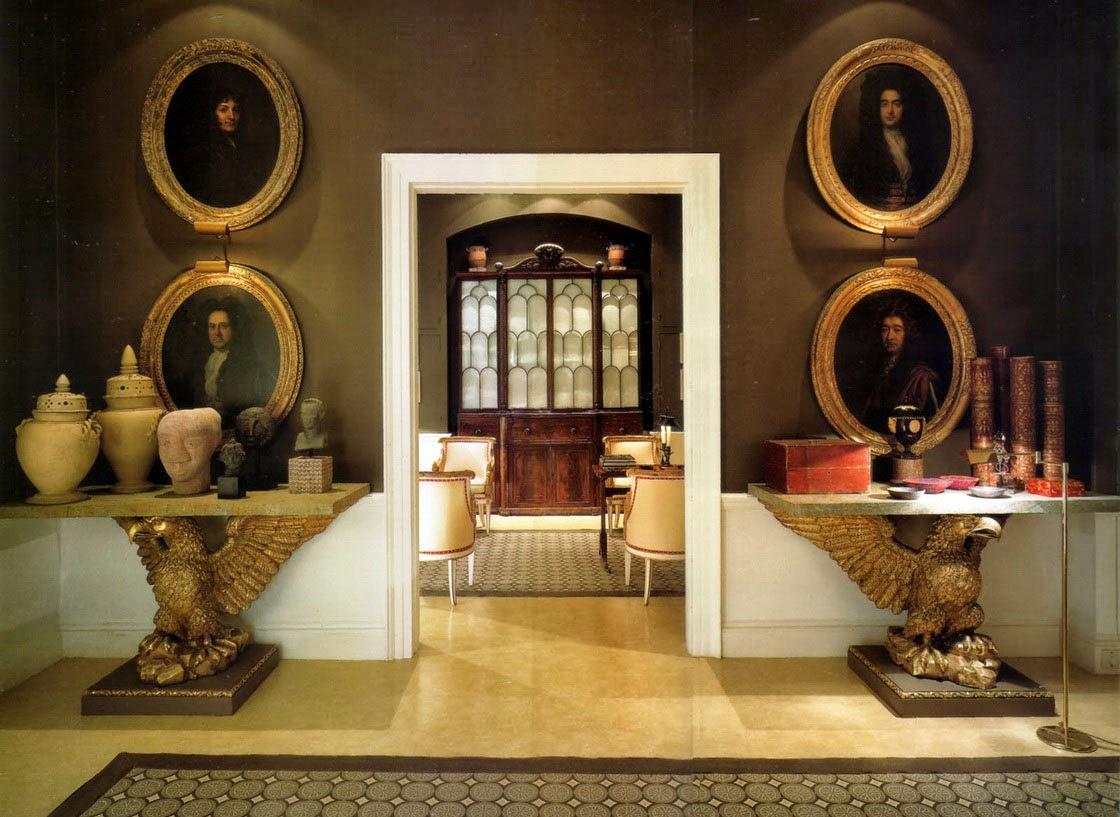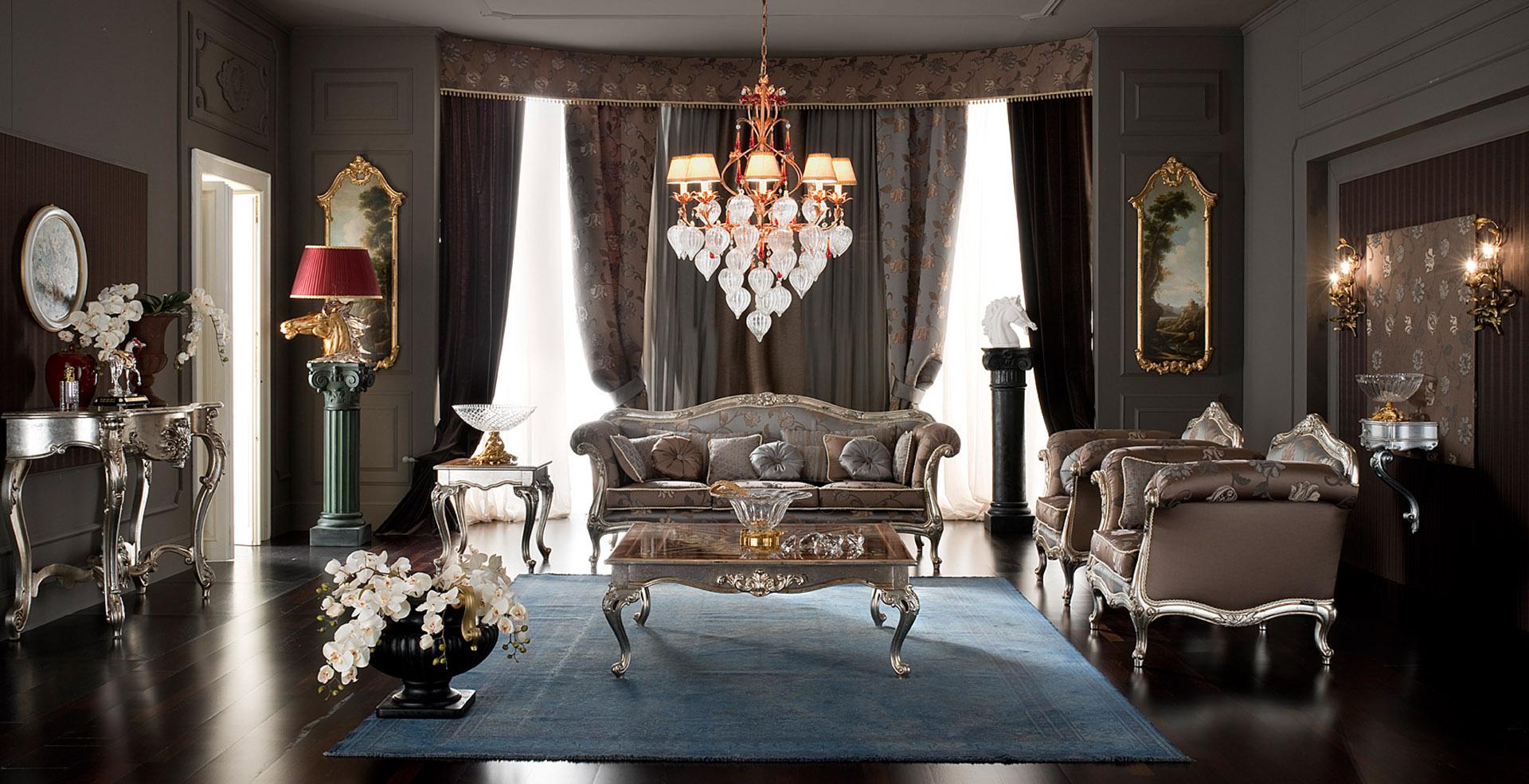 Все те же арки и высокие потолки, но цвета чаще светлые, без ярких акцентов, а еще добавляется показная роскошь: лепнина, зеркала в тяжелых рамах, классические картины, громоздкая мебель, металлические люстры с хрустальными элементами. Желательно скульптуры, статуэтки и фарфор, чтобы завершить картину.