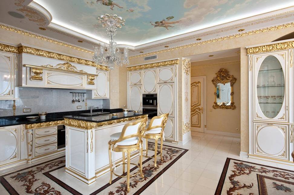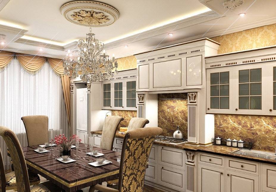 Интерьер кухни гостиной в классическом стиле барокко характеризуется яркостью и блеском. Он передает помпезность и зажиточность, с подчеркнутыми излишествами. Передать подобную атмосферу возможно благодаря использованию таких средств: