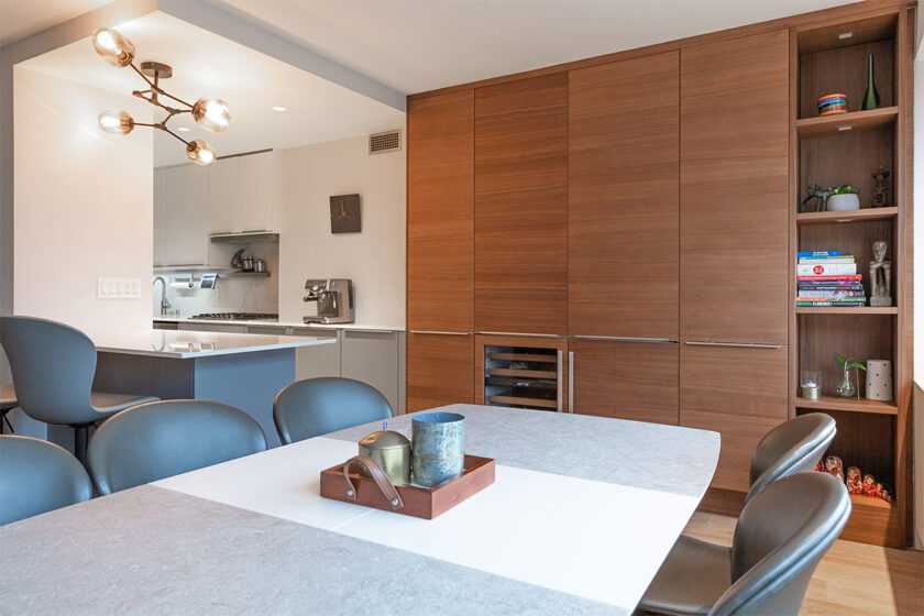 Даже в «номенклатурных» сталинках площадь кухонь не велика (10-15 кв. м), что уж говорить о «рядовых» с мини-кухнями метражом 7-9 кв. м. Кардинально изменить столь маленькое помещение можно лишь объединив его с прилегающей гостиной и/или коридором. При таком раскладе появляется возможность не только вынести столовую зону за пределы кухни, но и создать очень удобное для общения и домашних посиделок пространство.
