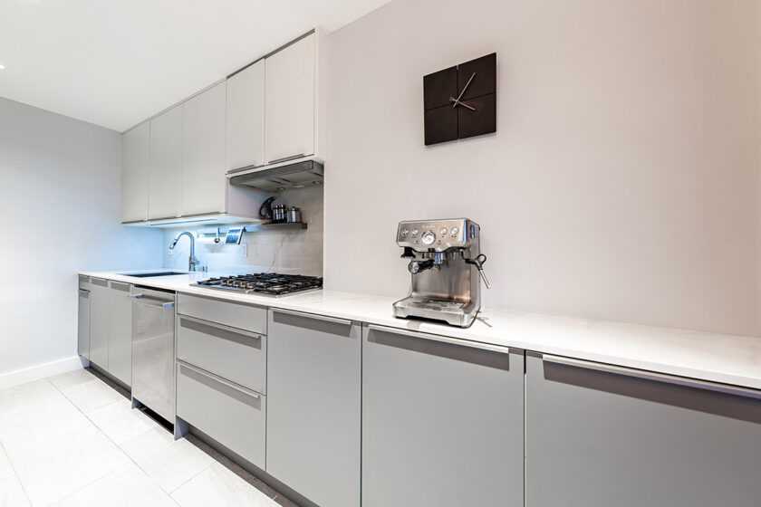В этой квартире по проекту дизайнера Маши Гульбекян (студия GuDesign) нельзя было объединять кухню и гостиную, так как первая газифицирована. Но визуально это все-таки сделали, использовав стеклянную перегородку со сдвижными дверьми. Это добавляет маленькой кухне воздуха и пространства, но при этом все необходимые требования соблюдены.