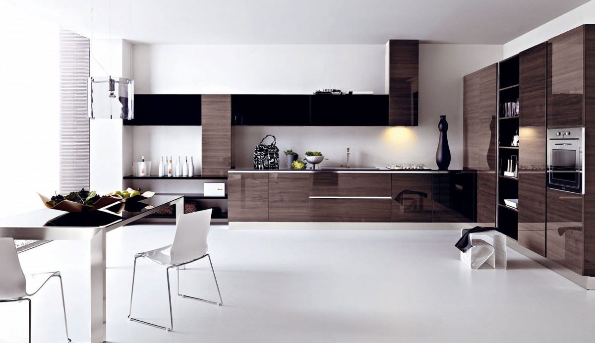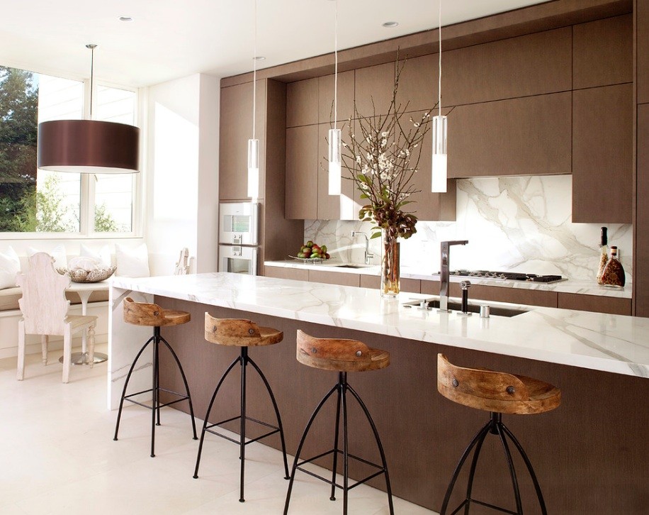 Допускаются эксперименты с различными видами отделки. В дизайне можно использовать древесину, а также имитацию таких материалов, как стекло, металл и камень. При этом коричневая кухня, сохраняя свою консервативность, выглядит более уютной, чем помещения, оформленные в других оттенках.
