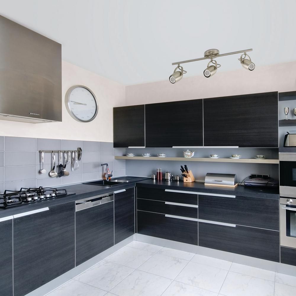 Освещение играет одну из главных ролей в дизайне помещений, поэтому следует выбирать экономичные LED-источники. Точечные светильники монтируют по периметру потолочной поверхности, а также их используют для подсветки рабочей зоны, устанавливая под верхними шкафчиками.