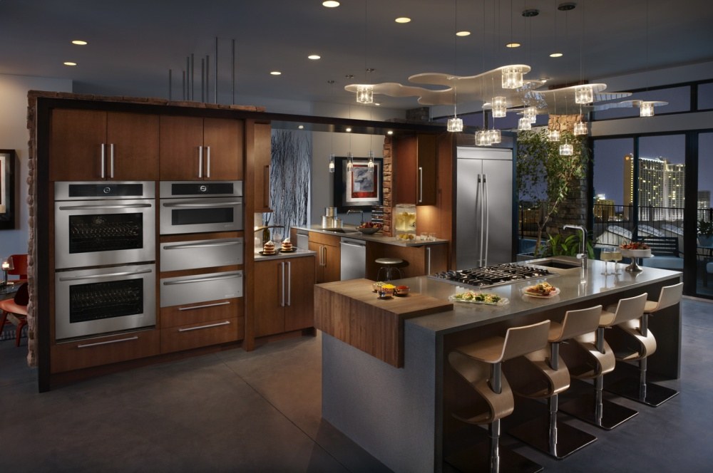 Стиль хай-тек считается одним из самых дорогих, поскольку оборудование и бытовая техника должны быть только ультрасовременными со стильным дизайном, встроенными мониторами и сенсорным управлением. Приборы могут совмещать в себе несколько опций, например, духовка с функцией микроволновки и гриля. Это значительно сэкономит пространство, и будет особенно полезно на маленьких кухнях.