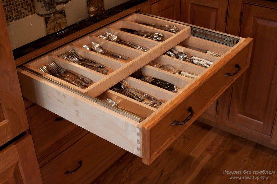 - Установите выдвижные ящики вместо распашных дверей. Облегчить поиск посуды, расположенной у дальней стенки шкафа, помогут выдвижные ящики. Глубина их может быть разная. Специальные пластиковые или металлические конструкции устанавливаются внутрь. Разделители образуют на дне ящика небольшие и удобные ячейки. Расширители увеличивают высоту стандартных боковых стенок выдвижной конструкции.
