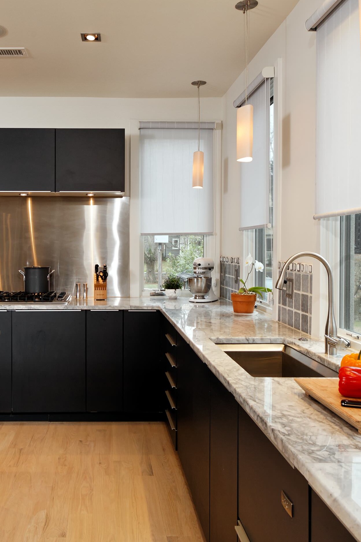 Но при этом слишком перегружать комнату темными тонами не стоит, лучше оставить стены светлыми. Яркий и контрастный цвет или рисунок можно добавить на фартук.