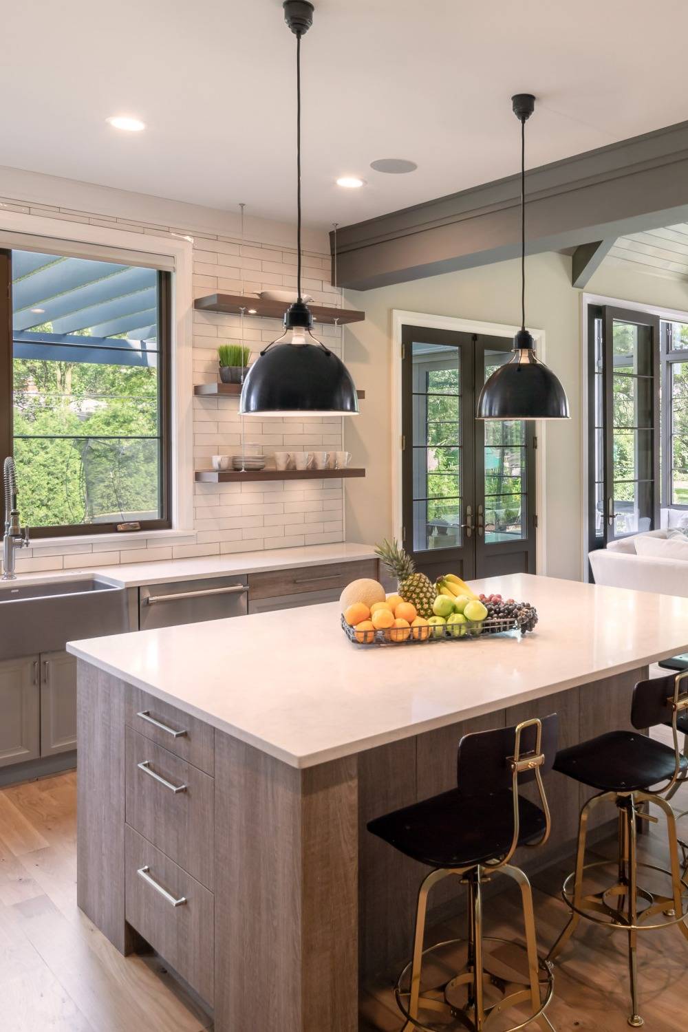 Гармоничным решением в декоре кухни-столовой станет совмещение выносной конструкции с обеденной зоной, однако при этом освещаться она будет подчеркнуто различными системами, светильники которых должны включаться отдельно стоящими выключателями.