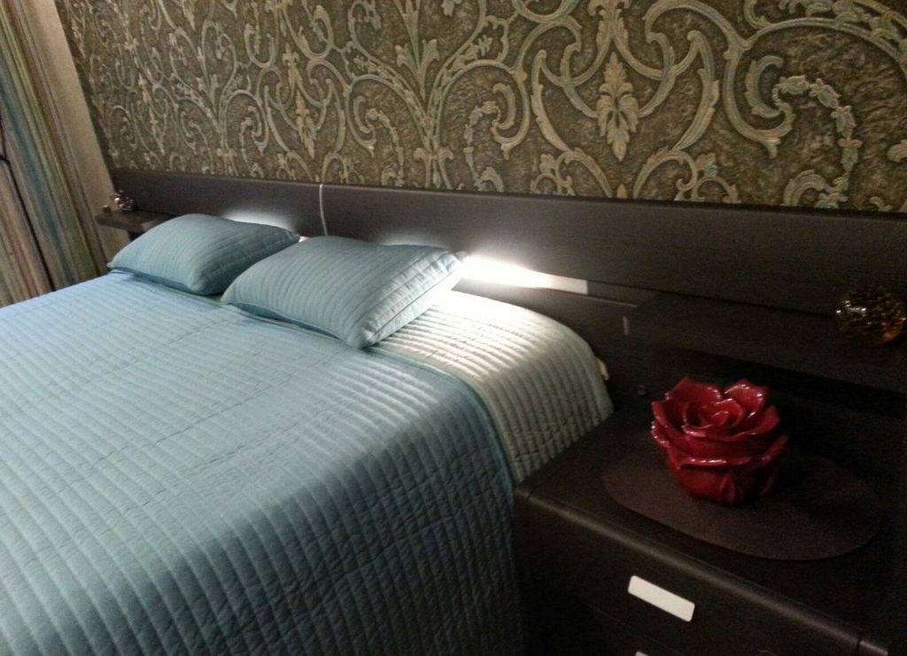 Для романтичного настроения можно воспользоваться метровой светодиодной лентой. Ещё можно использовать подсветку на полках, которые находятся над кроватью. Магазины дизайна продают наборы осветительных приборов, это избавляет от поисков одинаковых по стилю светильников.