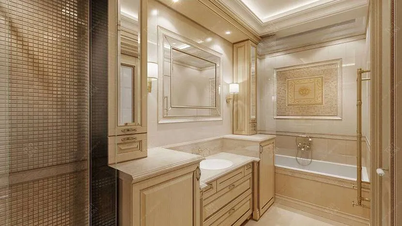 Пример дизайна маленькой ванной комнаты в стиле современная классика. С умывальника подняты стакан для зубной щётки и дозатор мыла