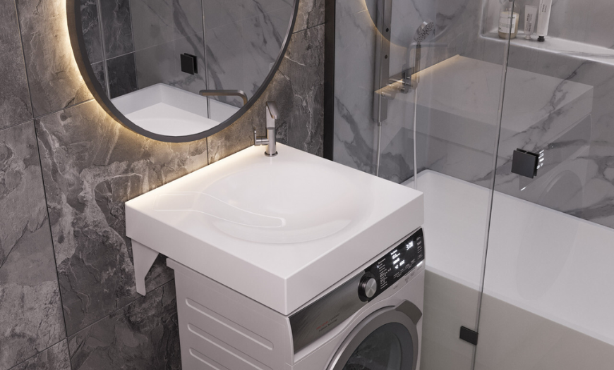 Отличным решением считается использование подвесной сантехники. Например, раковина, висящая на стене, позволяет рационально использовать пространство и спрятать стиральную машинку.