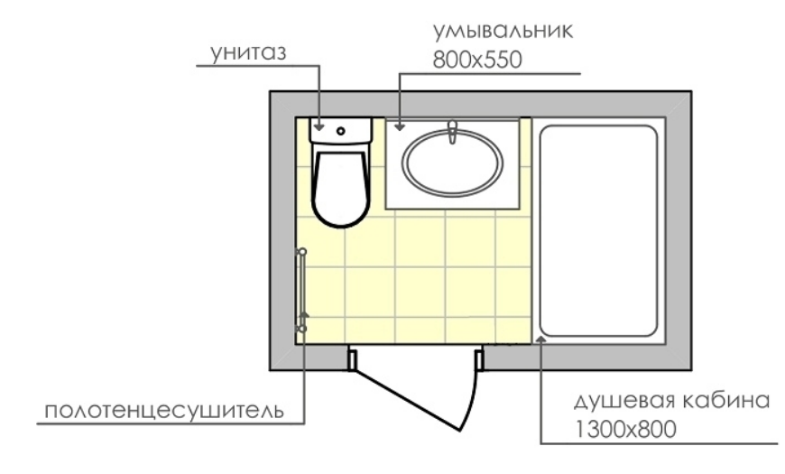 Ванная комната без туалета позволяет разместить напротив входа ванну с пластиковыми дверцами, справа от двери – компактный умывальник, слева – небольшую стиральную машину.