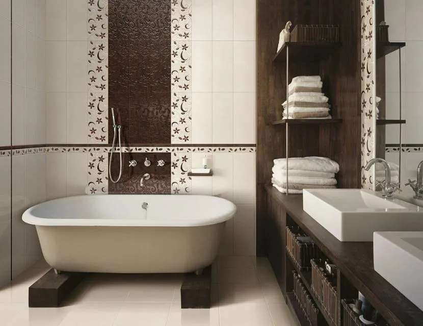 Способ расположения плитки и ее размеры позволяют зрительно увеличить малогабаритную ванную комнату. Мелкая и мозаичная плитка увеличивает пространство, для этих целей также подойдет материал с орнаментом и горизонтальными полосами. Отделать можно не все стены, а отдельные участки.