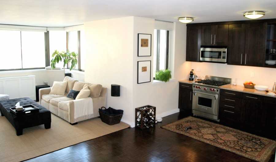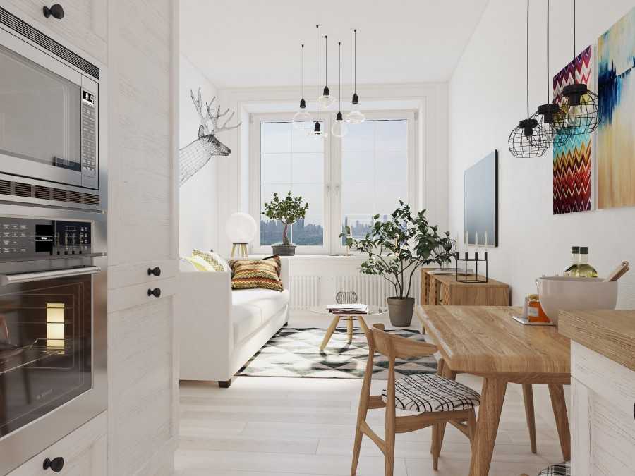 Часто, при ремонте сносят стену кухни и прилегающей к ней комнаты, но учтите, что она не должна быть несущей! На фото маленькой квартиры показана увеличенная таким способом кухня — студия, оформленная проёмом с барной стойкой.