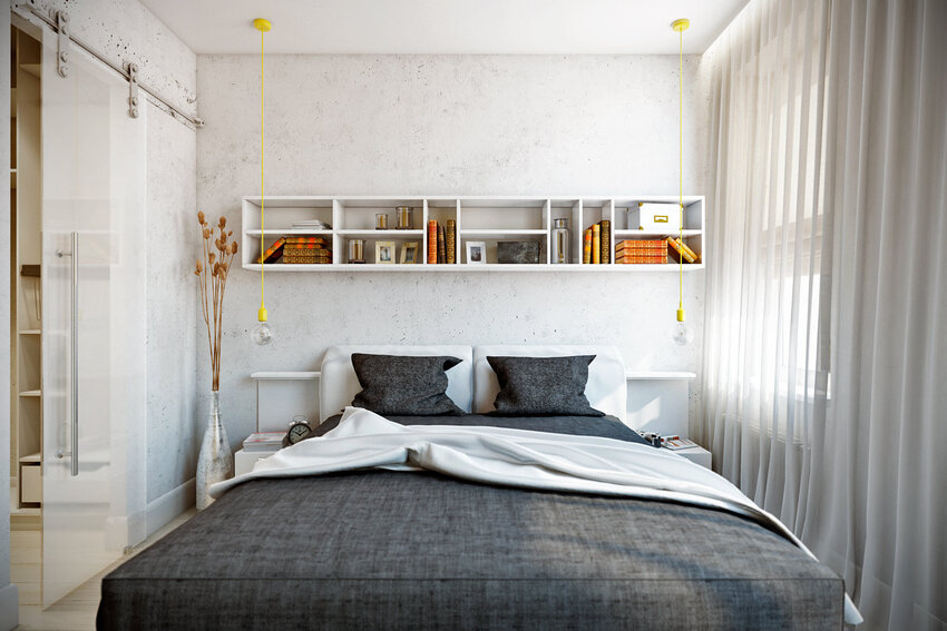 Правильным решением для небольшой спальни будет светлая цветовая палитра, а различные акценты не позволят создать скучный интерьер. К неяркой отделке отлично подходит сочный контрастный текстиль с любыми узорами. Абсолютно белый тон может быть слишком холодным и неуютным, поэтому здесь не обойтись без интересных дизайнерских решений.