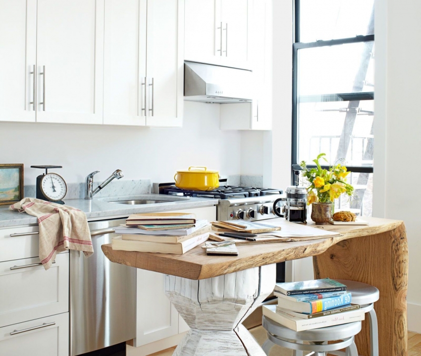 Удачным решением для организации небольшой зоны приема пищи при является круглый стол, стол-барная стойка или стол-подоконник.