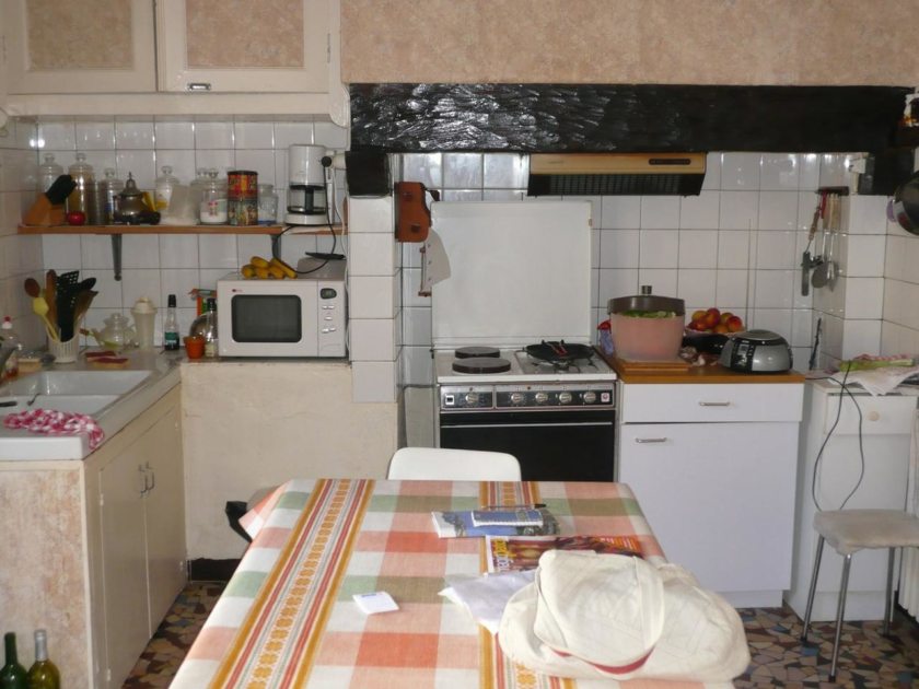 На первом этапе кухня полностью освобождается от мебели и ненужной бытовой техники. Холодильнику можно тоже на время переустройства найти место в гостиной.