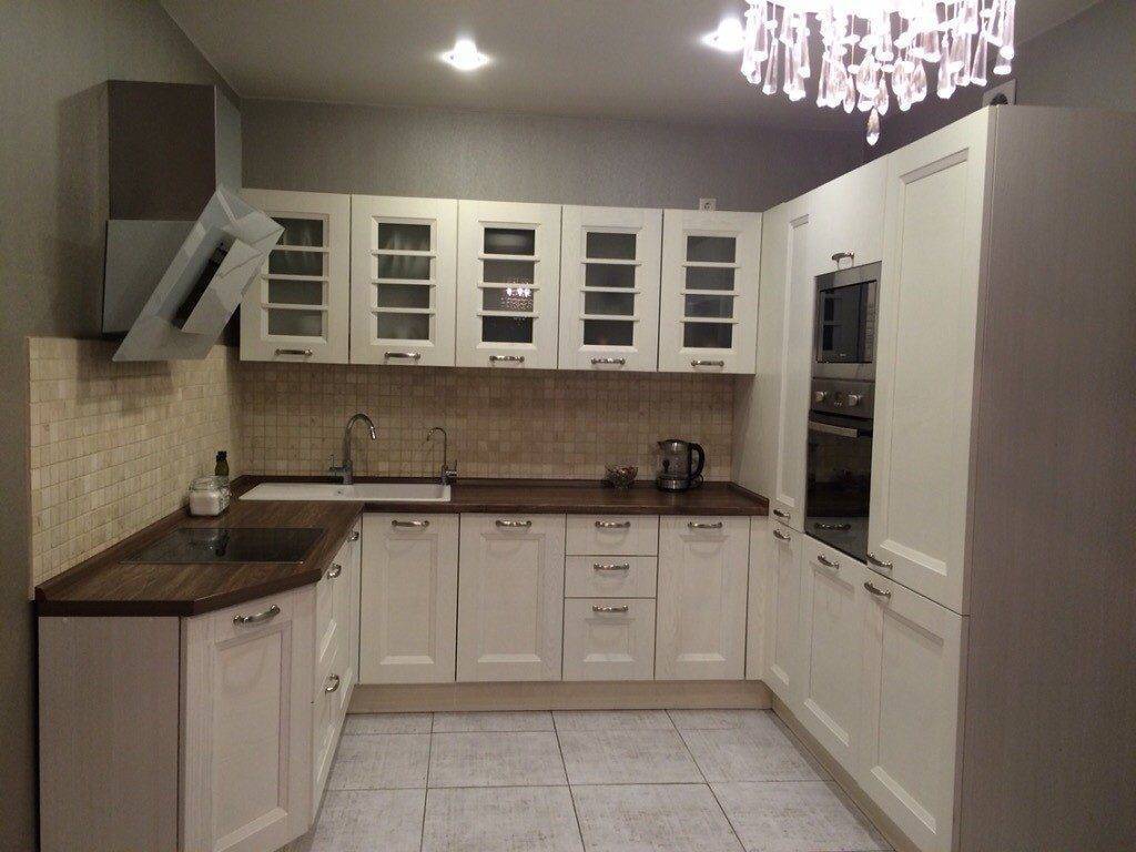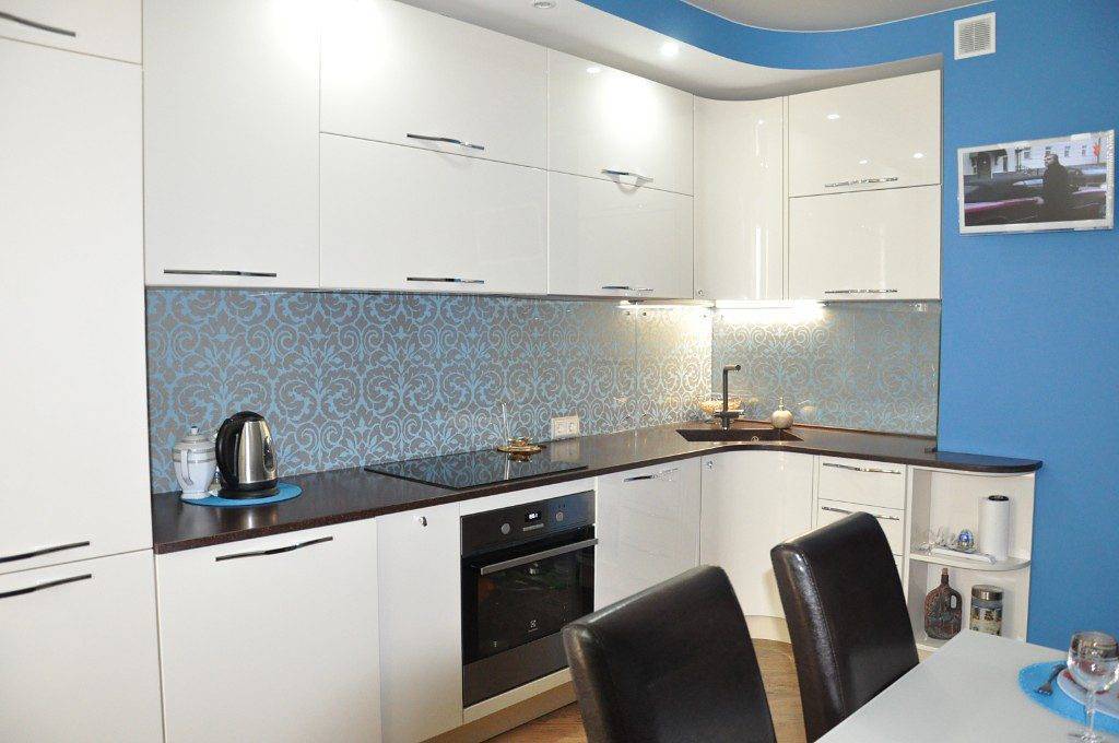 угловая — приемлемая для комнаты любой геометрии. За счет Г-образной формы в ней можно компактно разместить гарнитур с мойкой, холодильником и плитой.