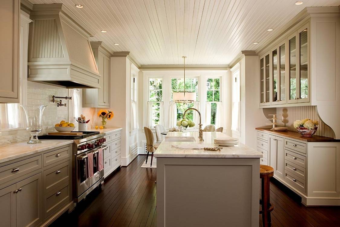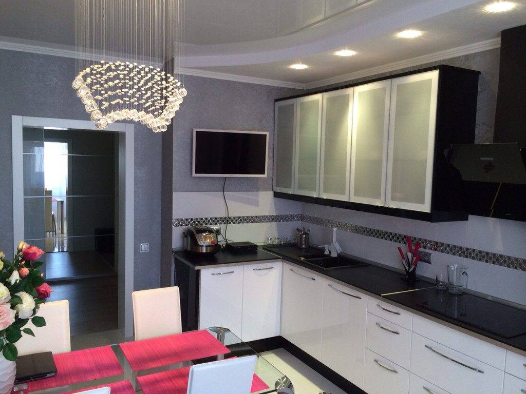 В зависимости от высоты потолков, также просчитывается и размер кухонной мебели. Помимо основного освещения посреди кухни, нужно учесть и дополнительные источники света – точечные светильники очень помогут в подобном решении проблемы. Они могут расположиться по всему параметру помещения, и помогут в той ситуации, когда будет отключено главное освещение – создавая приглушенный свет и романтическую атмосферу. Если их разместить исключительно над рабочей зоной, то можно сэкономить денежные средства на счетах за электричество. На этапе планировке специалисты советуют также предусмотреть установку дополнительных приборов для комфортной работы – вытяжку, монтировку микроволновой печи, духовки.