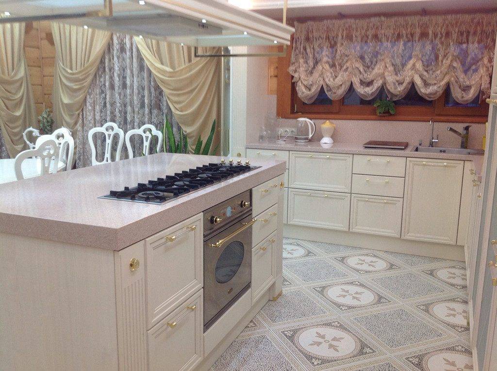 Классика – это всегда вычурная монументальность, громоздкая деревянная мебель и дорогие материалы. На первом плане – симметрия и правильная геометрия, поэтому хорошо смотрится остров с Г-образной кухней, выставленные прямоугольником.