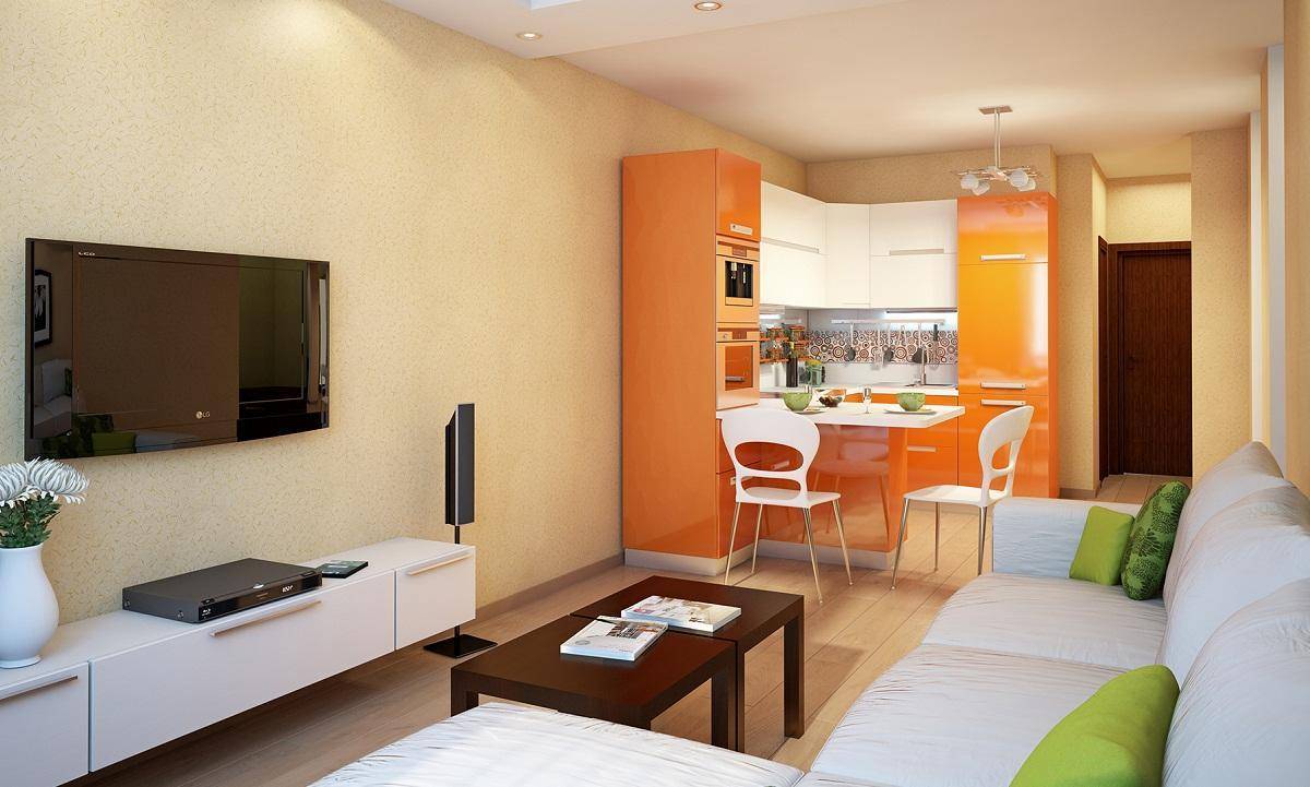 Такое просторное помещение легко может вместить и полноценную обеденную зону, что является несомненным критерием при выборе жилья семьей из 4 и более человек, особенно с меленькими детками. Ее, в свою очередь, можно оборудовать кухонным уголком, телевизором и различными аксессуарами.