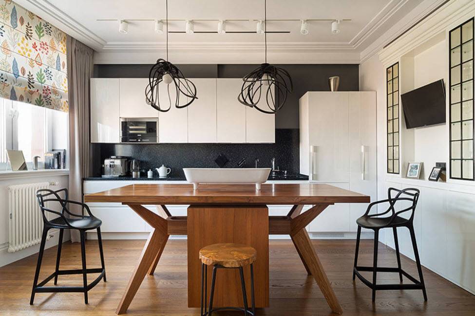 - Для создания дизайна в виде шахматной доски можно использовать черную плитку, но при этом площадь кухни в квартире должна составлять не менее 9 квадратных метров.