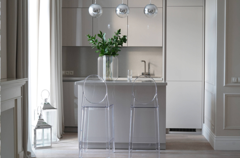 Кухня будет такой же светлой, просторной и, конечно же, белой. Фасады и стены здесь выполняются в молочном цвете, поэтому они кажутся единым целым. Такая мебель кажется малозаметной, поэтому визуально практически не занимает места в помещении.
