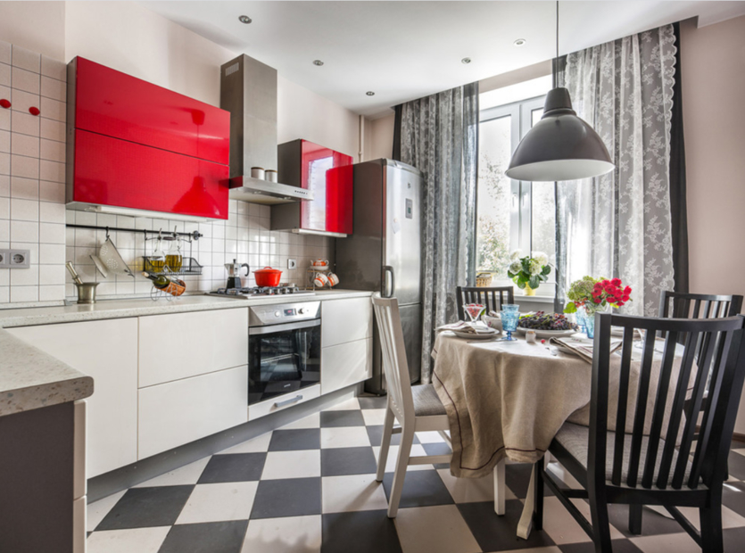 При оформлении кухни в этом стиле стоит учитывать оптические свойства красного цвета. При разработке дизайна кухни красные оттенки лучше использовать только как акцент на определенных элементах, чтобы не перегружать пространство.