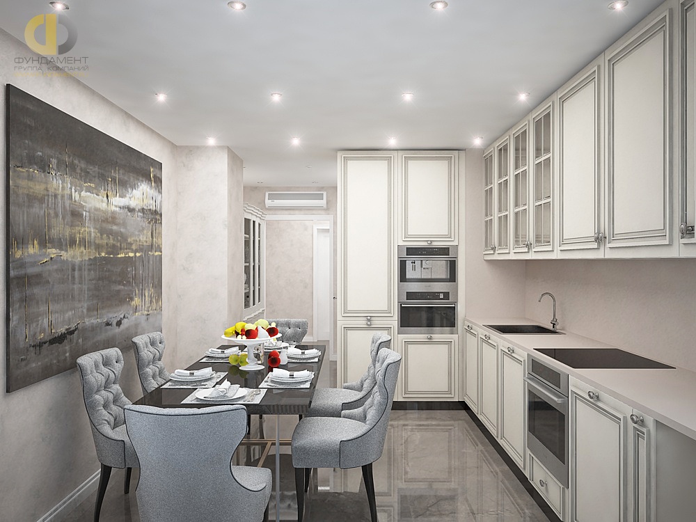 Если кухня совсем маленькая, а от обеденной группы отказываться не хочется, то стоит рассмотреть вариант перепланировки квартиры. Кухню 9 метров можно успешно объединить гостиной и получить просторную столовую, в центре которой разместится стол и стулья, а по одной из стен — кухонный гарнитур со всей утварью и техникой. Этот метод хорош тем, что расширяет список возможных стилей для оформления интерьера.