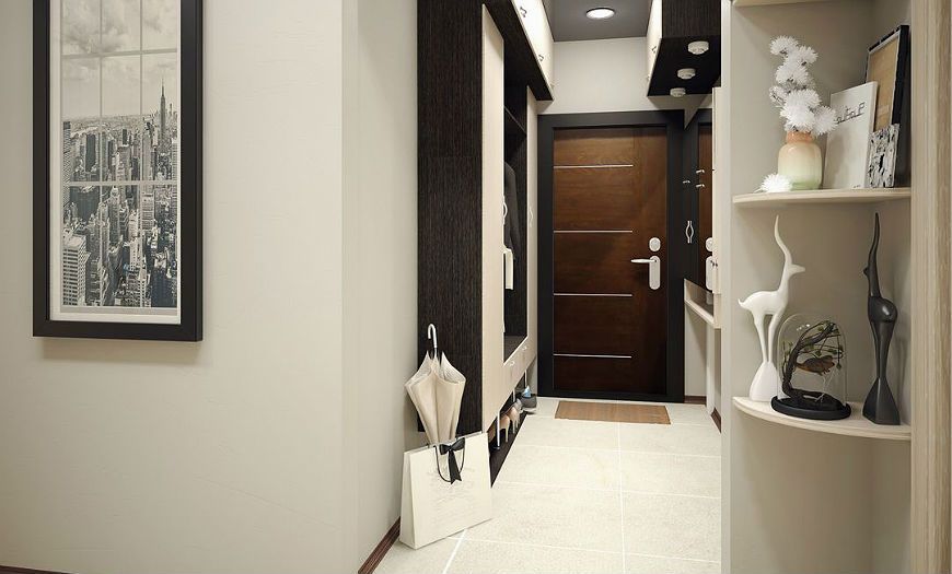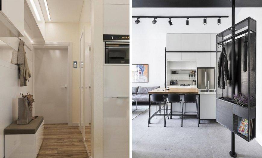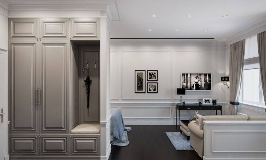 Входная зона в студиях чаще всего маленькая и узкая. В ней достаточно расположить самые необходимые предметы: настенное зеркало, несколько крючков для верхней одежды, подставку для обуви. Если планировка позволяет, можно установить шкаф-купе, эффективно использующий пространство у стены.
