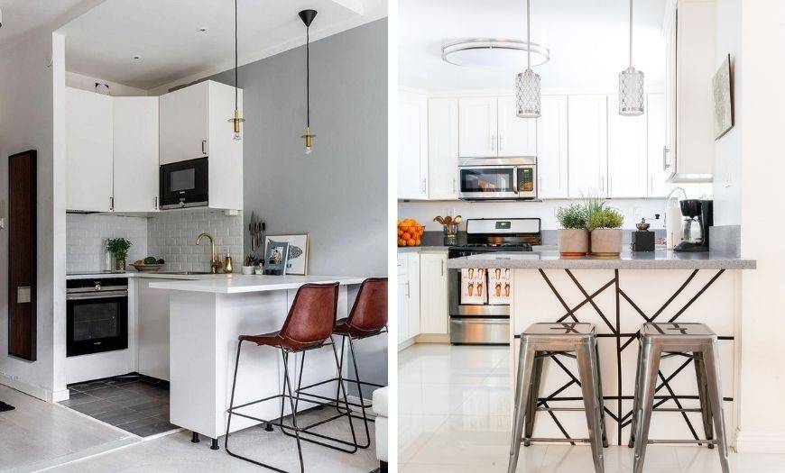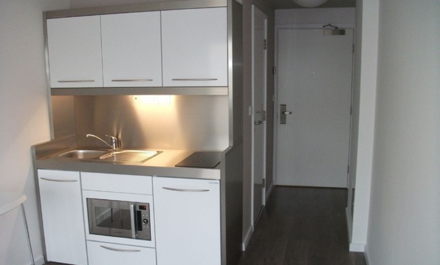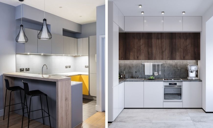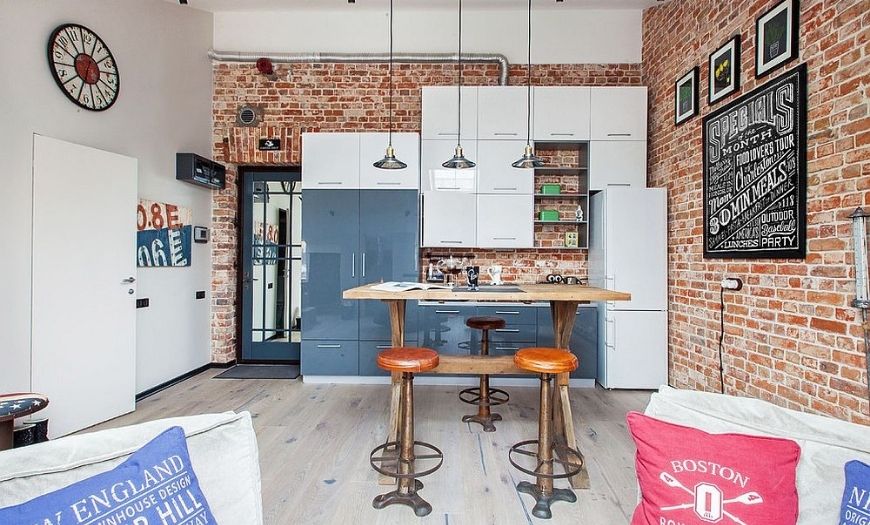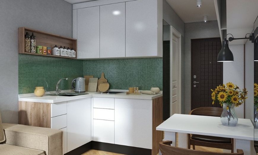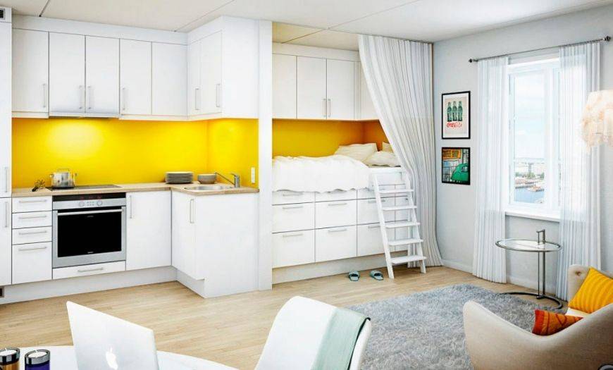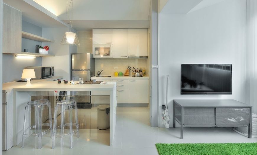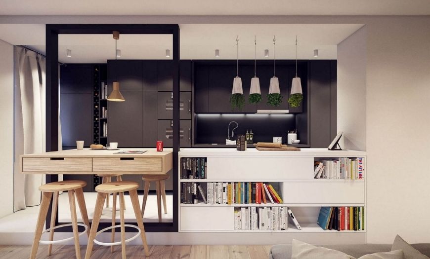Зону кухни отделяют от остального пространства перегородкой, мебелью либо зонируют при помощи отделки. В квартире-студии удачным выбором будет встраиваемая и многофункциональная техника: посудомоечная машина, электродуховка, мультиварка. Пространство на стенах не оставляют пустым, а используют для размещения навесных шкафов для хранения посуды и кухонных принадлежностей.