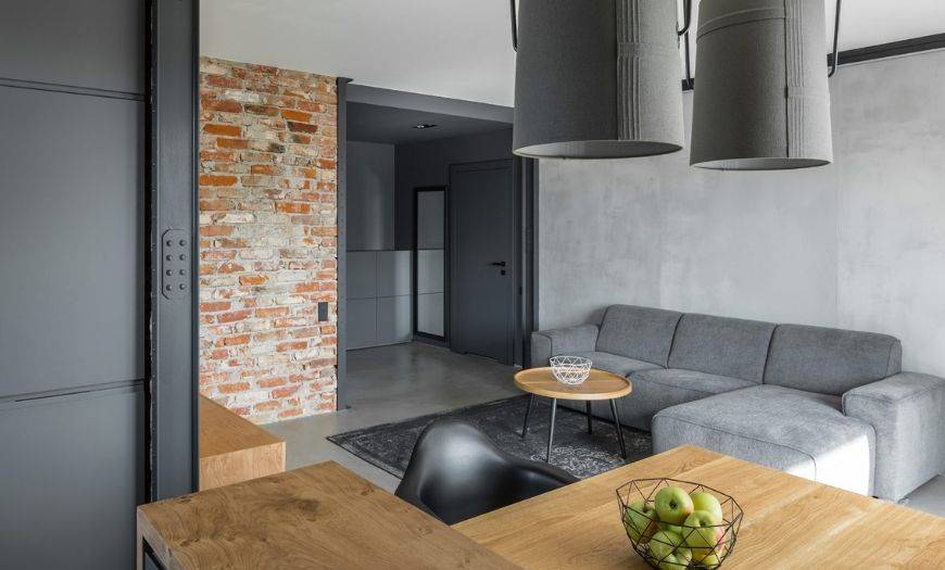 При отделке помещения лидирующее место отводится белому и серому цветам. Для разграничения пространства часто используется черный полутон. Добавить в гостиную солнечного света можно с помощью мягких кремовых тонов. Гармонично вписываются в интерьер зала (фото наглядно это отображают) все натуральные оттенки и фактуры дерева, камня и кирпича. Преимущество отдается темно-коричневому цвету, который проявляется в мебели, напольном покрытии, декоративных вставках на стенах.